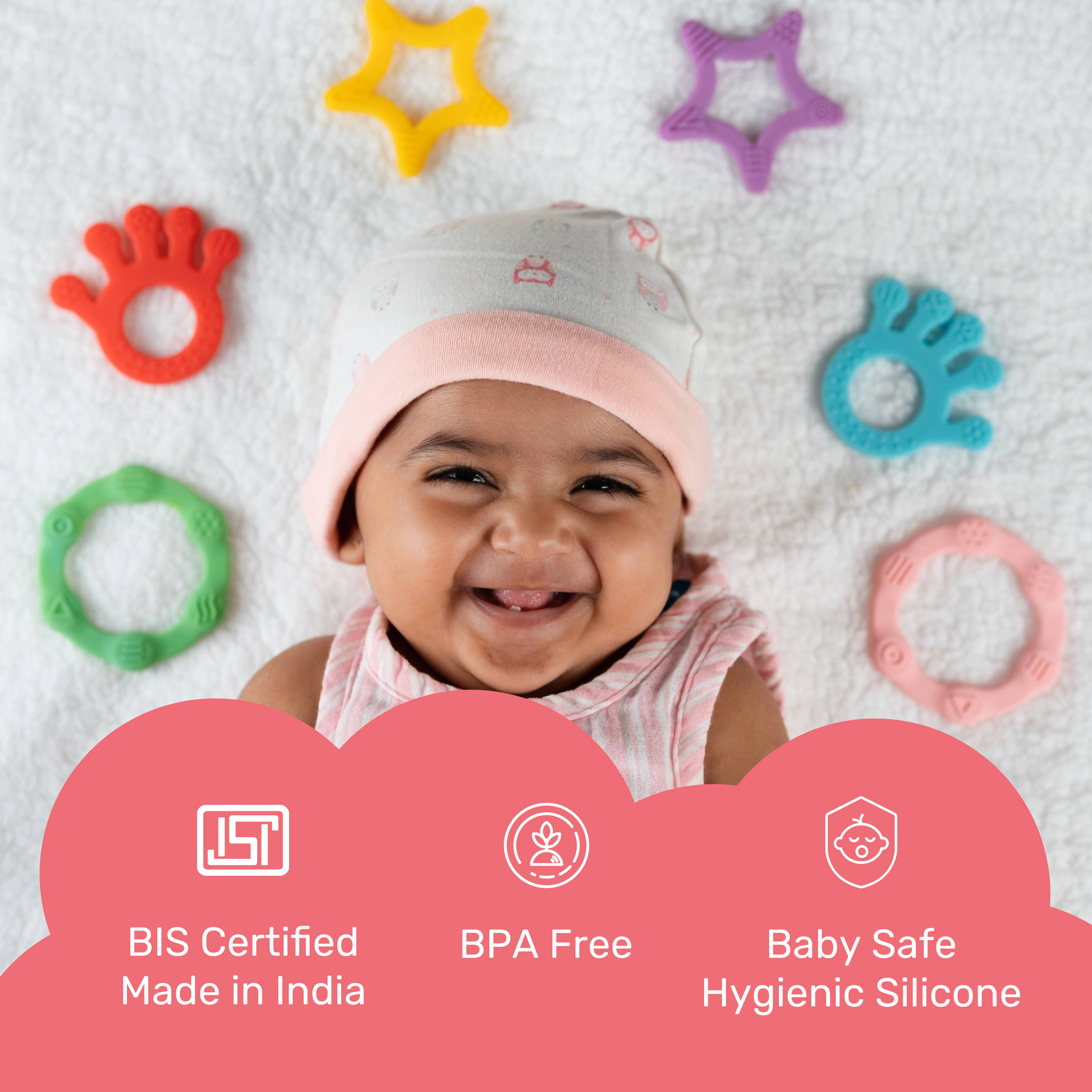 The soft, flexible, multi-textured design soothes sore gums and provides comforting teething relief.